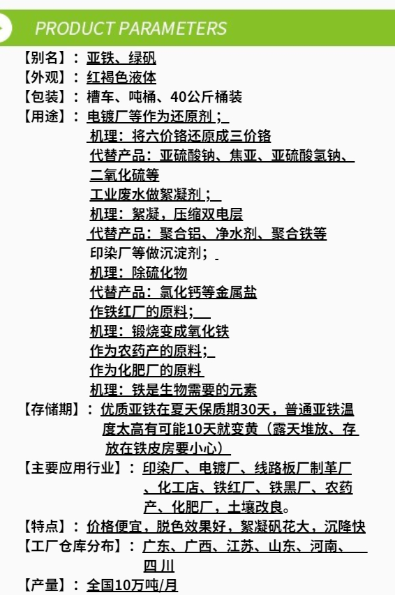 廣泛用于印染,造紙,生活污水,工業(yè)廢水的絮凝澄清與脫色,硫酸亞鐵還可用以處理含鉻廢水和含鎘廢水.等高堿度,高色度廢水處理,可以減少中和用酸的大量投入。