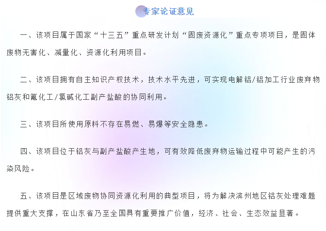 與會專家聽取了建設企業(yè)及技術(shù)團隊對技術(shù)總體情況的匯報。在充分質(zhì)詢、討論后,專家一致認為,本項目技術(shù)路線合理、前期基礎扎實,可實現(xiàn)電解鋁/鋁加工鋁灰和副產(chǎn)鹽酸的協(xié)同利用,屬典型的資源循環(huán)利用項目。