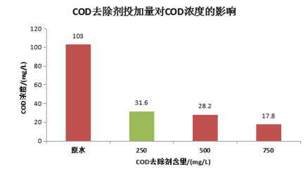 通過小試數(shù)據(jù),在pH值為7.5的情況下,最終選擇濃度為250mg/L的COD去除劑,處理效果最佳,可確保出水COD達標。該去除效果相比之前客戶使用聚合氯化鋁噸水處理成本降低33%,去除效率更高。
