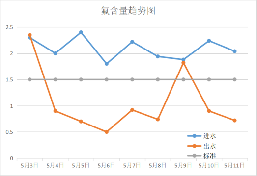 客戶(hù)混凝沉淀均使用聚鐵,出水氟超標(biāo),后改用長(zhǎng)隆II型除氟劑在第二段混凝沉淀投加450mg/L后出水穩(wěn)定達(dá)標(biāo),5月9日為清理儲(chǔ)藥池投加聚鐵后出水明顯上升。